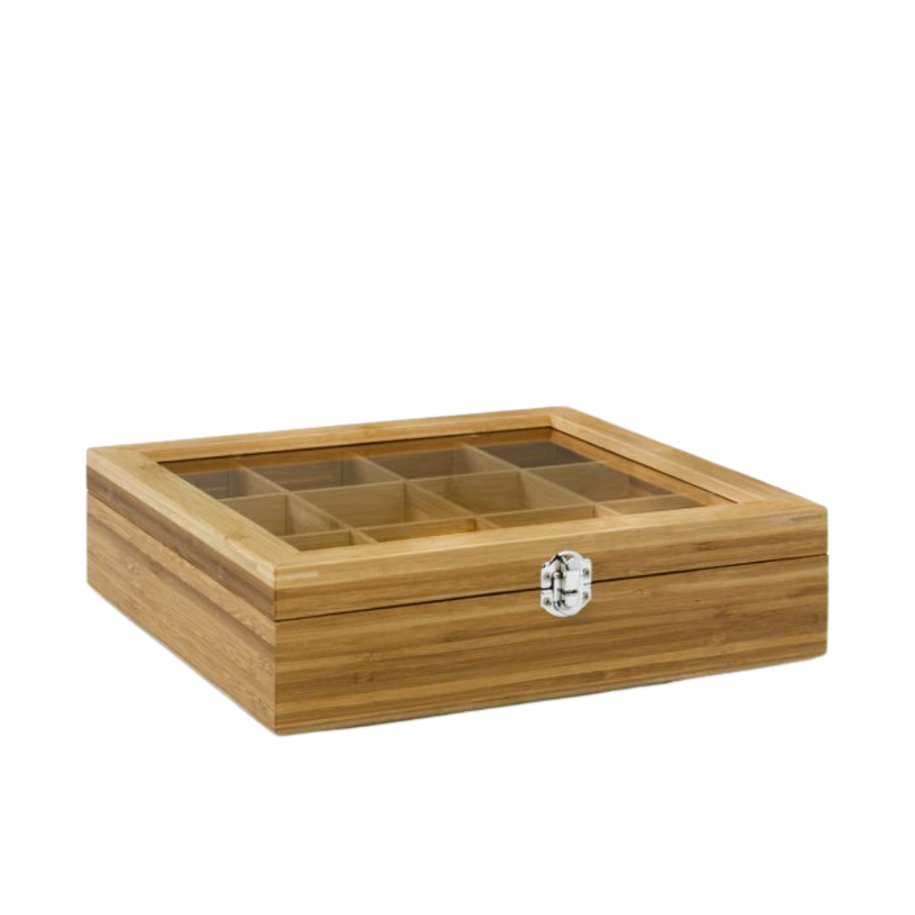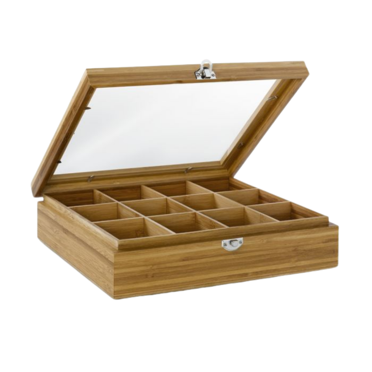 Deze theedoos van Bredemeijer heeft 12 vakken en is met doorschijnend venster. Deze theedoos is ideaal voor het bewaren van theezakjes. Met sluiting van roestvrijstaal. Gemaakt van bamboo.