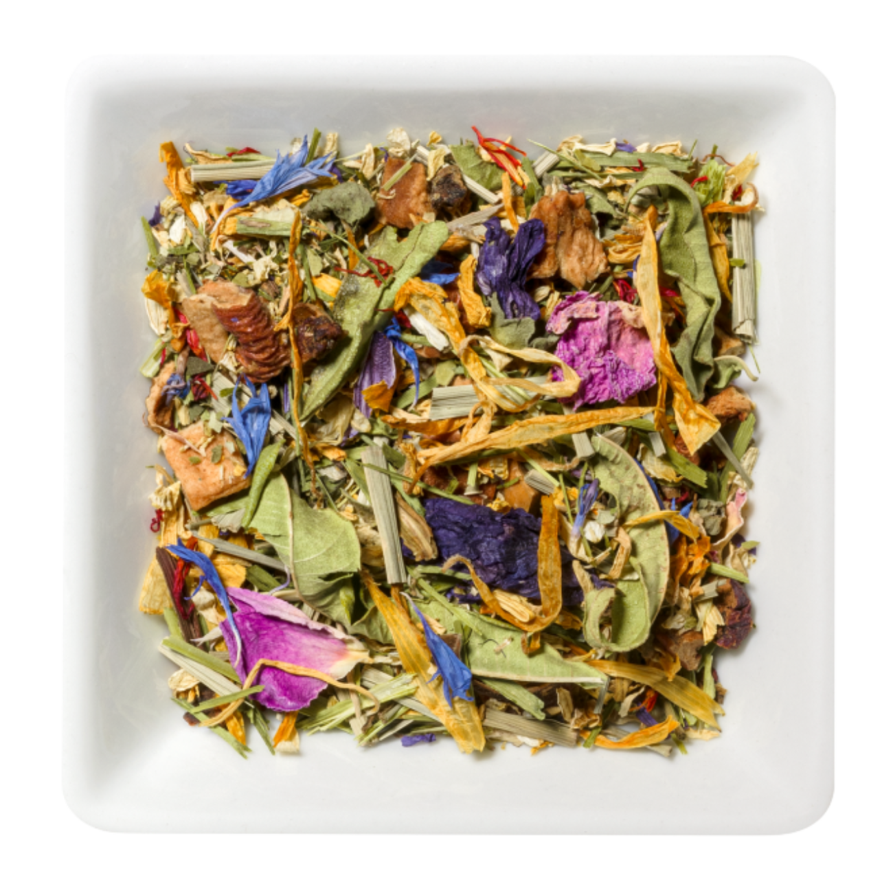 Laat uw zintuigen betoveren door Hemelse Tuin, een natuurlijke fruitmelange en kruidenmix die net zo prachtig oogt als hij smaakt. De frisse, bloemige geur en delicate citrus- en fruittonen brengen meteen het gevoel van lente tot leven. Deze uitgebalanceerde blend is zowel warm of als ijsthee een heerlijke traktatie. Een echte blikvanger in uw theekast én in uw kopje.