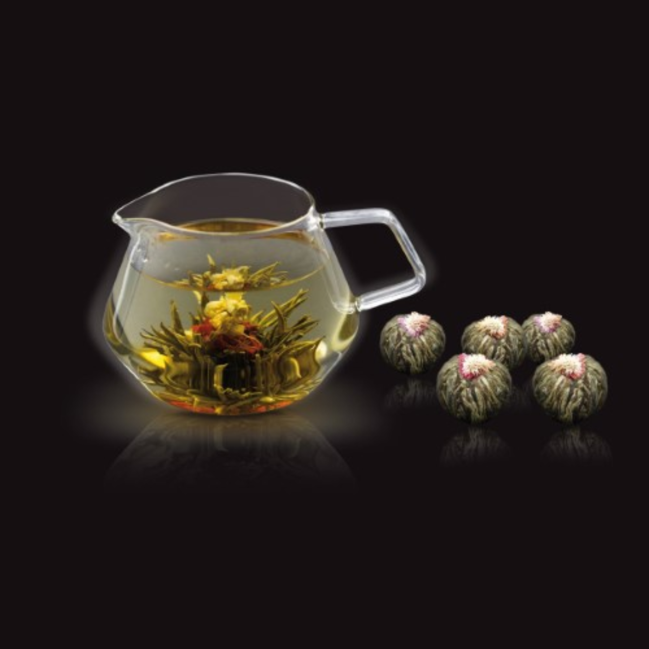 De theebloem Precious bestaat uit groene thee uit Fujian met jasmijnbloemen en goudsbloemen.