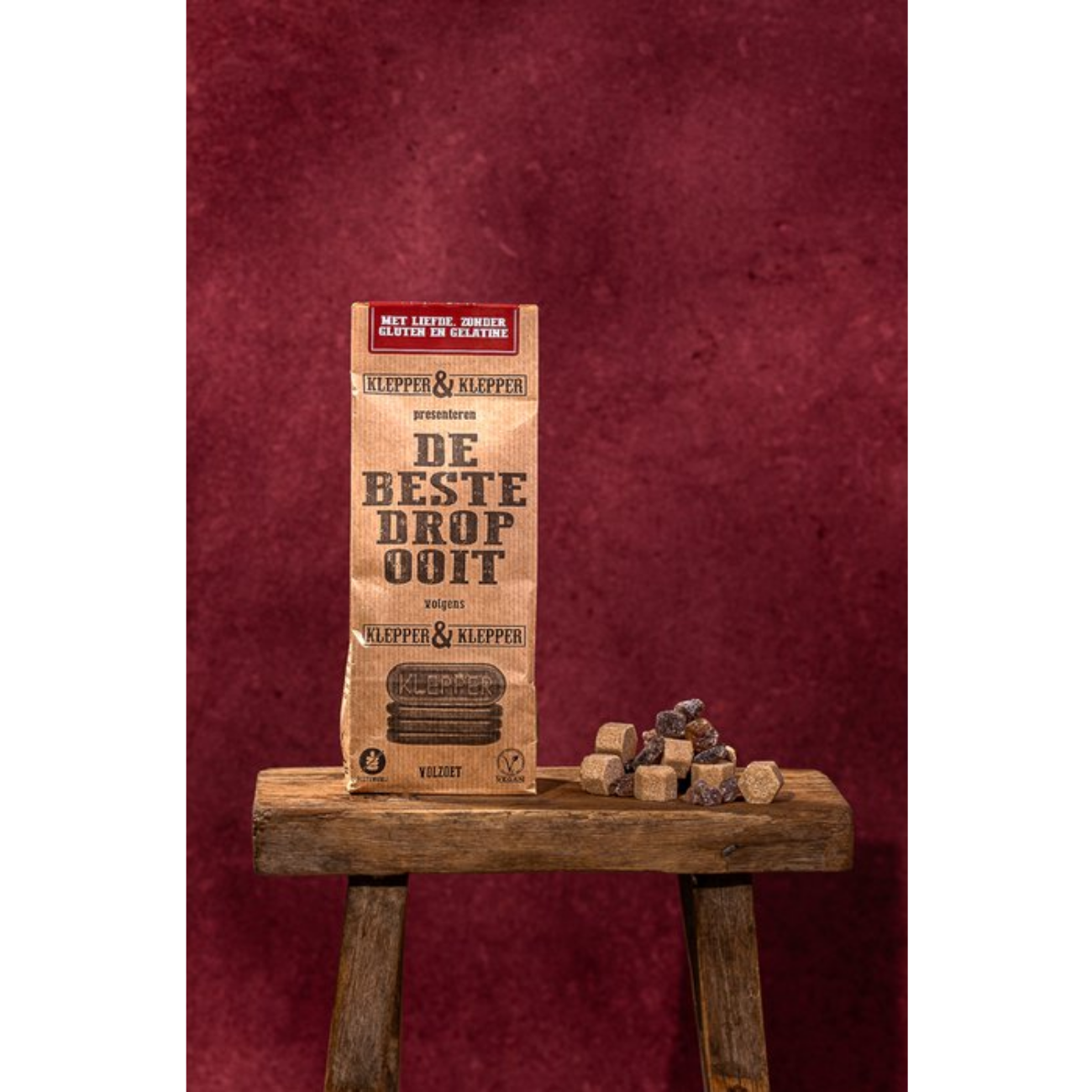 Klepper & Klepper hier. Wij willen u van harte feliciteren met het bekijken van de beste drop ooit. U zult er geen spijt van krijgen. Dit dropje hebben wij ontwikkeld toen Klepper Sr. 25 jaar op de markt van Alkmaar stond. Na al die jaren weet hij precies wat de mensen lekker vinden. En dat proef je! Na een beetje experimenteren hadden we het voor elkaar: het lekkerste dropje ooit. En door een gelukkig toeval bleek het geen gelatine en ook geen gluten te bevatten. Zodat wij, Klepper & Klepper, vrij snel tot de conclusie kwamen dat dit niet alleen de lekkerste, maar zelfs de beste drop ooit is! Al zeggen we het zelf.