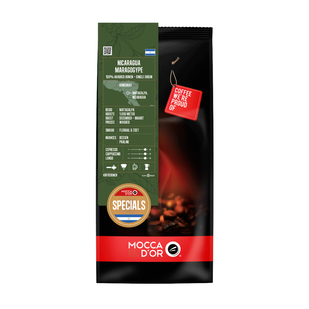 Nicaragua Maragogype is onderdeel van de Mocca d'Or Specials. Dit is een bijzonder assortiment aan bijzondere Single Origins koffies, zorgvuldig uitgekozen door het kwaliteitsteam van Mocca d'Or. De Specials worden verpakt per 500 gram.
