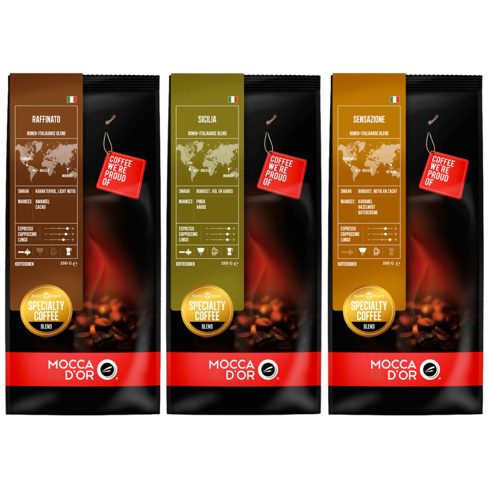 Ben je gek op koffie in Italiaanse stijl? Probeer dan het proefpakket 'Italia' en ontdek welke van Mocca d'Or's Italiaanse blends het beste bij jou past. Dit proefpakket bevat drie handige proefzakjes van 250 gram en is nu extra voordelig: van €26,85 voor slechts €25,95!