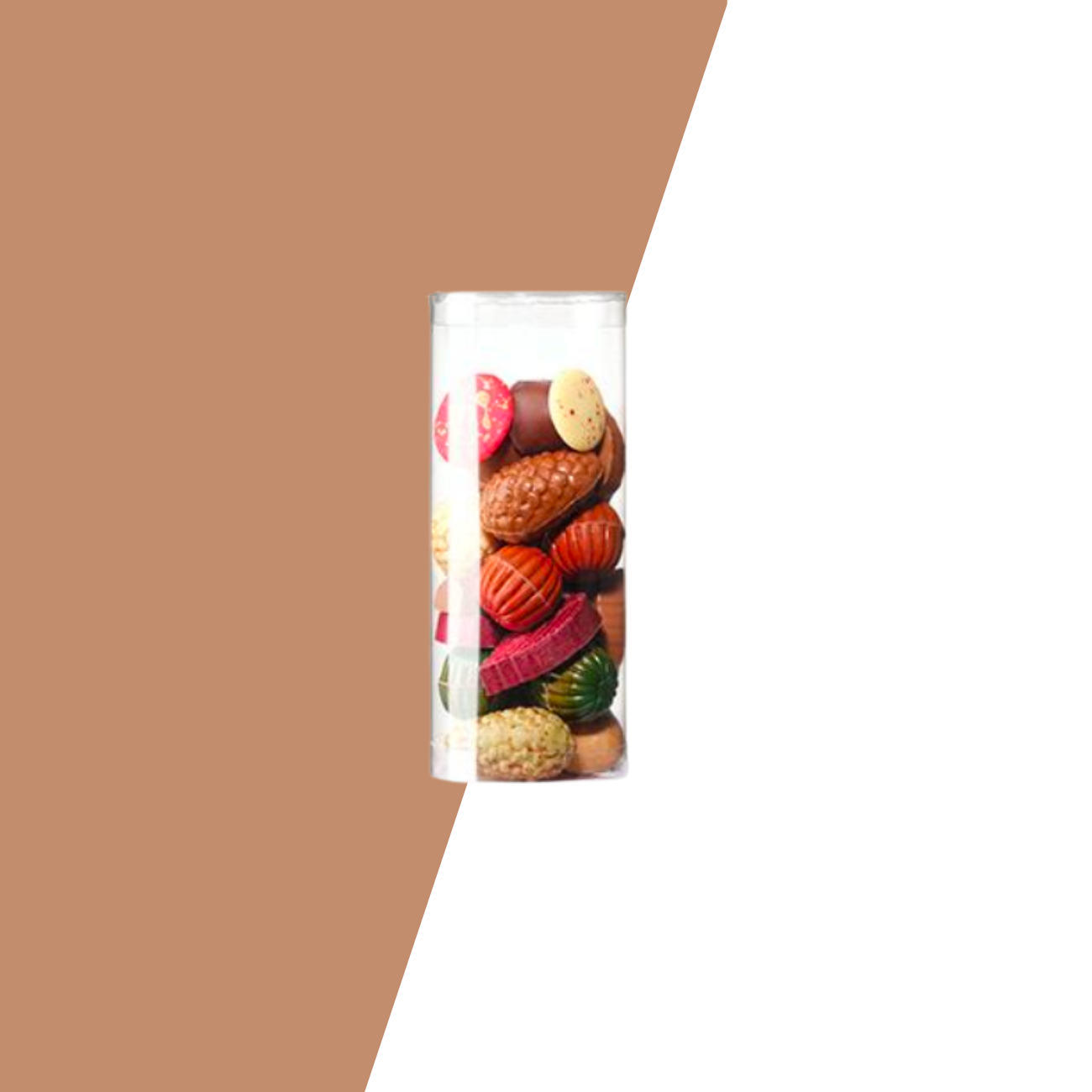 Deze herfstkoker bestaat uit een assortiment van de herfstbonbons van Visser Chocolade. Het bevat een variatie aan pure, melk en witte chocolade bonbons in verschillende smaken. De koker bevat 250 gram.