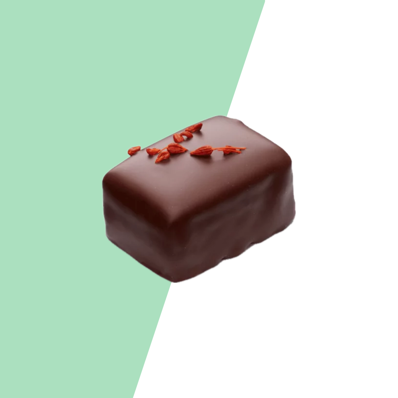 Een heerlijke bonbon van Tanzania chocolade, gevuld met een duindoornbesganache en een dun laagje duindoornbesgelei.
