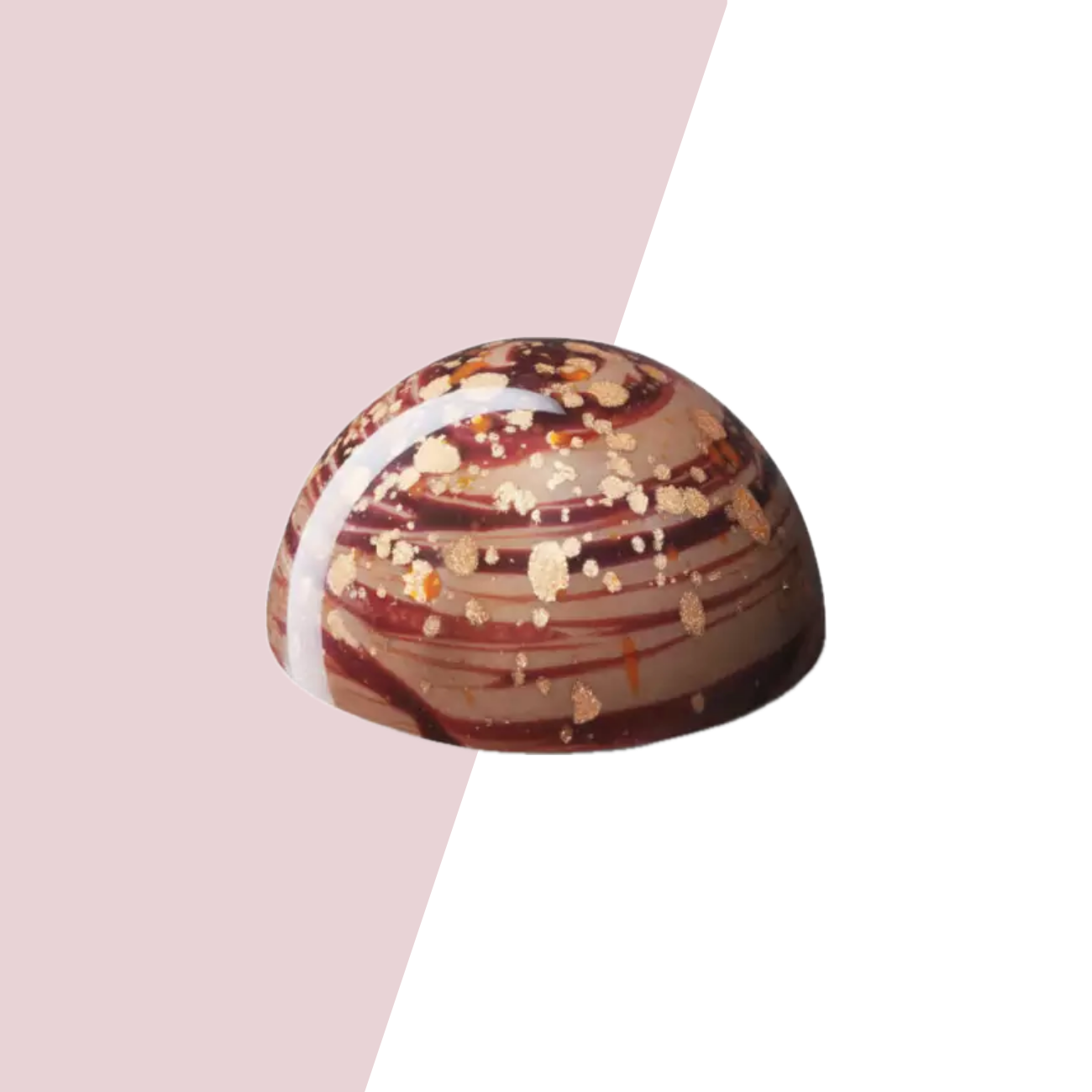 Een heerlijke én prachtige bonbon, gevuld met ganache crème van melkchocolade met rozemarijn, gecombineerd met een karamel op basis van 'maple syrup' (ahornsiroop gemaakt van essdoornsap).